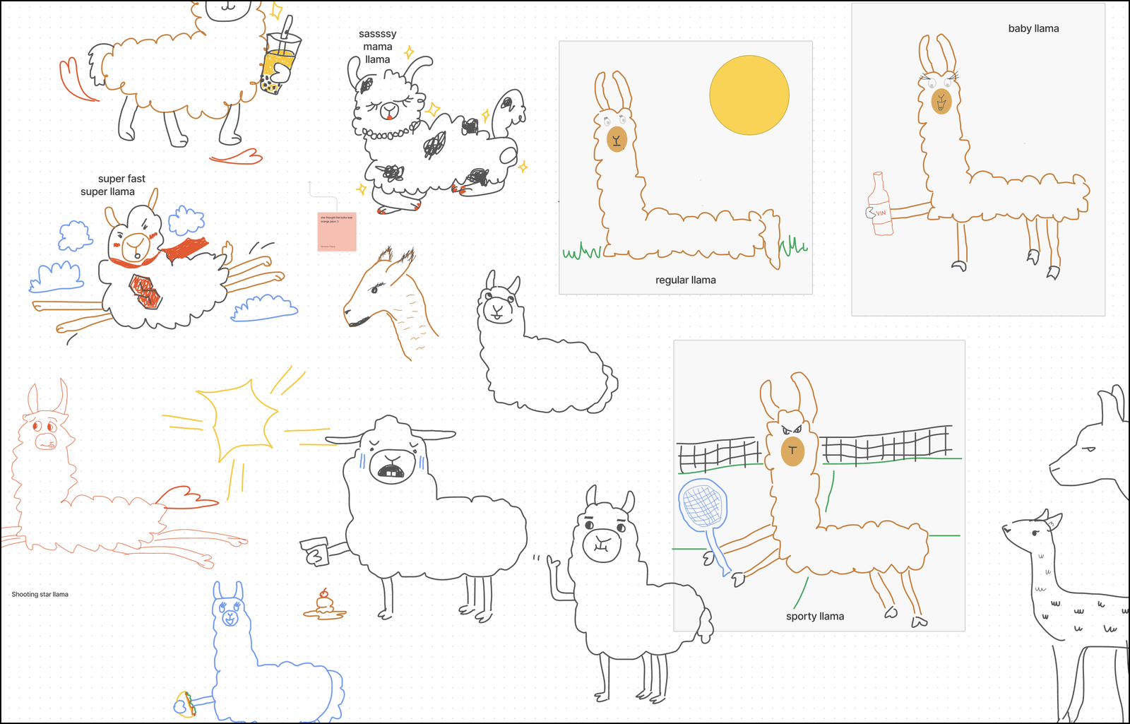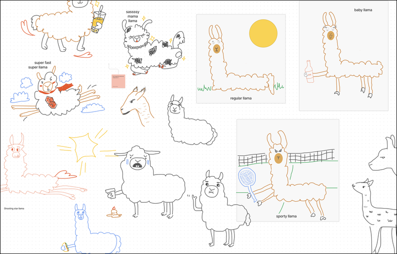 To celebrate the launch of FigJam, the marketing team spent an hour with a cartoon artist who taught them how to quickly sketch llamas. A llama named Cadbury guest-starred on Zoom while the team drew together using the pen tool—weird, but we loved it.