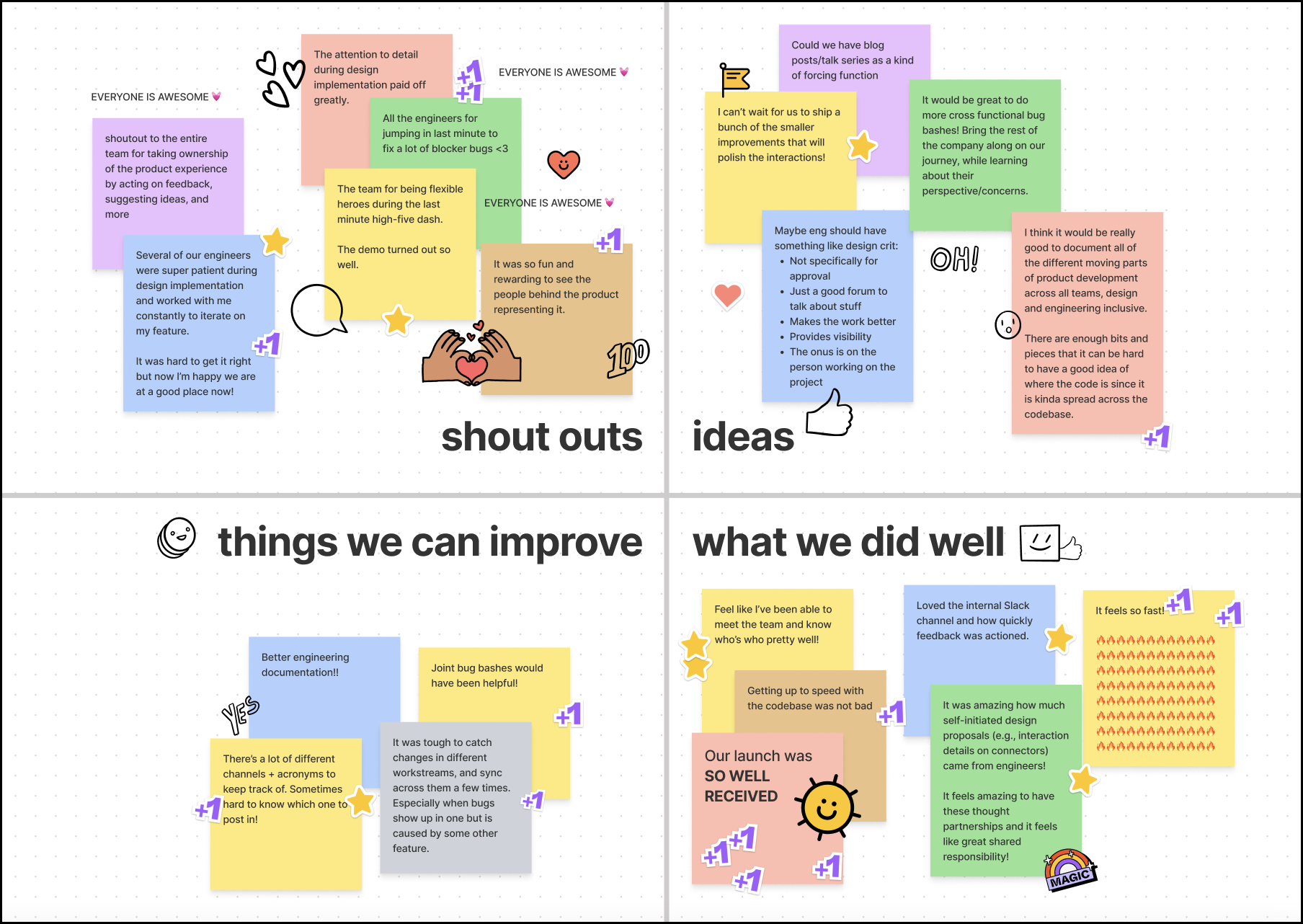 We recently shared how the PM team runs retrospectives in FigJam. Other teams follow the same template, including what went well, areas for improvement, shout-outs, and ideas for future building. In a recent retrospective including engineering, design, and product management, Engineer Karl Jiang noted that FigJam creates a low barrier to entry for people who are shy about giving feedback. This is the real power of FigJam stickies—auto-labeling provides an advantage for widespread teams with varied levels of verbal participation: in FigJam, everyone's contributions are automatically visible from a quick scan.