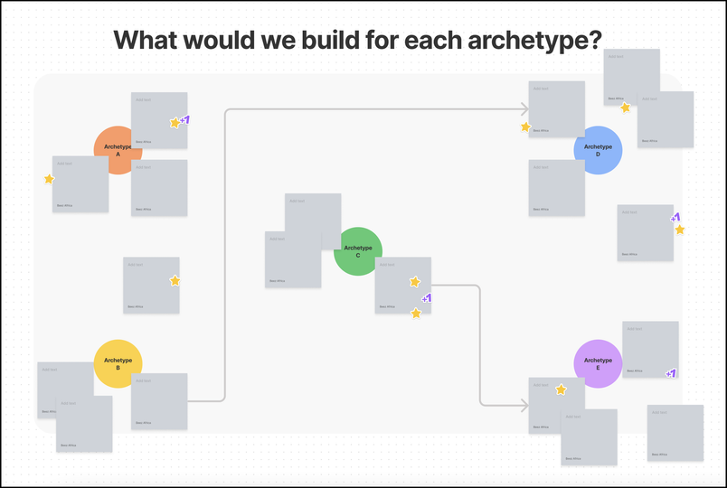 Above is one of multiple matrix templates Vanessa and the research team use. In this one, Figmates fill up with takeaways from a research report concerning different archetypes of FigJam users. Recently, Vanessa invited leaders across Figma’s design, engineering, and product teams to read the report and fill out the FigJam file on their own before meeting to discuss the research together.