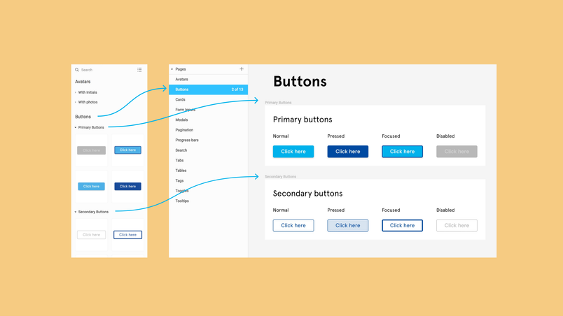 What good is a library if it isn't organized? We recommend using frames and pages to organize your component libraries and design systems into collections that make sense for you and your team. By doing this you can cut down on all the forward slashes and keep your component names nice and simple. This also helps your team browse through your library with ease!