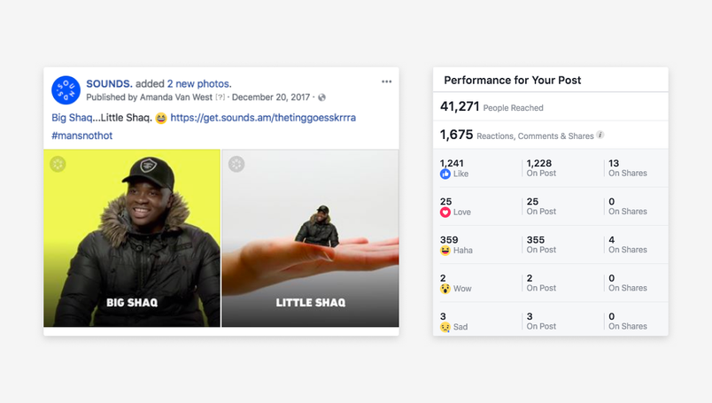 Step one was doing a content analysis of Facebook pages in the music/media/app space (shout out to TV Time and Unilad Sound!), to learn what types of posts had the highest engagement, and then using those findings to put together what types of posts we wanted for Sounds.