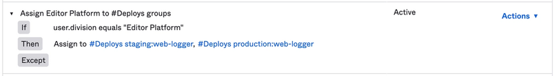 Group Rules allow you to assign a user to a group based on a predicate written in the Okta Expression Language. In our case, this means that we can create many groups—one for each permission—and then use rules to automatically assign those groups to users based on the team listed in their Okta profile. This way, applications can check for a specific group related to the permission, eg. #Deploys dev_environments, instead of checking for a list of team names. This has the added advantage of making it easy to see what permissions a team has: just check the Group Rules in Okta where the team is mentioned, and you’ll see all of the group relationships that that implies.
